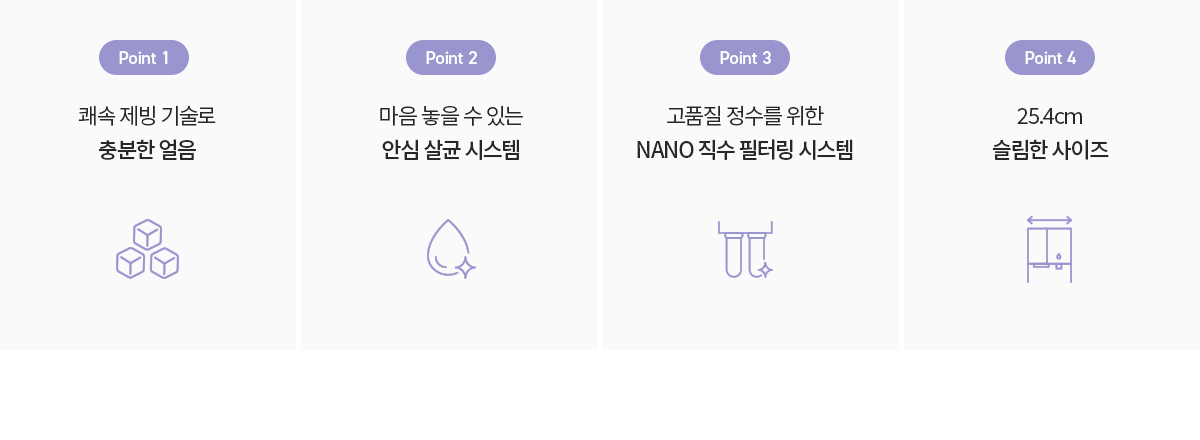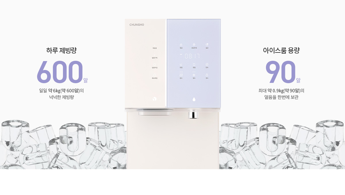 * 쾌속 제빙 시 시간당 약 24알의 얼음 지속 생성(쾌속 제빙: 주위 온도 25°C, 원수 온도 10°C 기준)