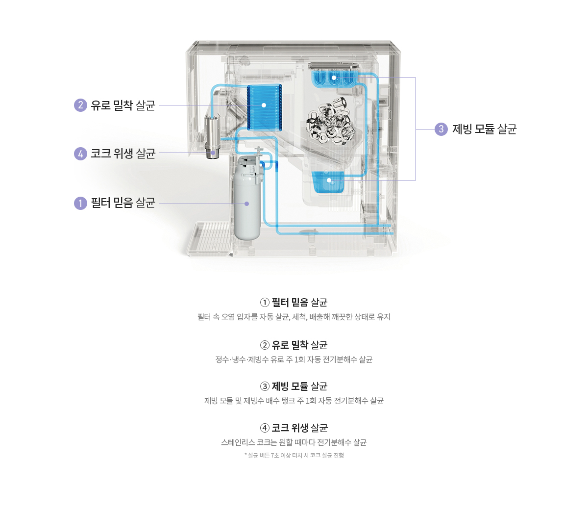 얼음의 근본이 되는 물부터 깨끗하도록! 필터와 유로 살균은 물론, 제빙 모듈과 코크까지 살균합니다.