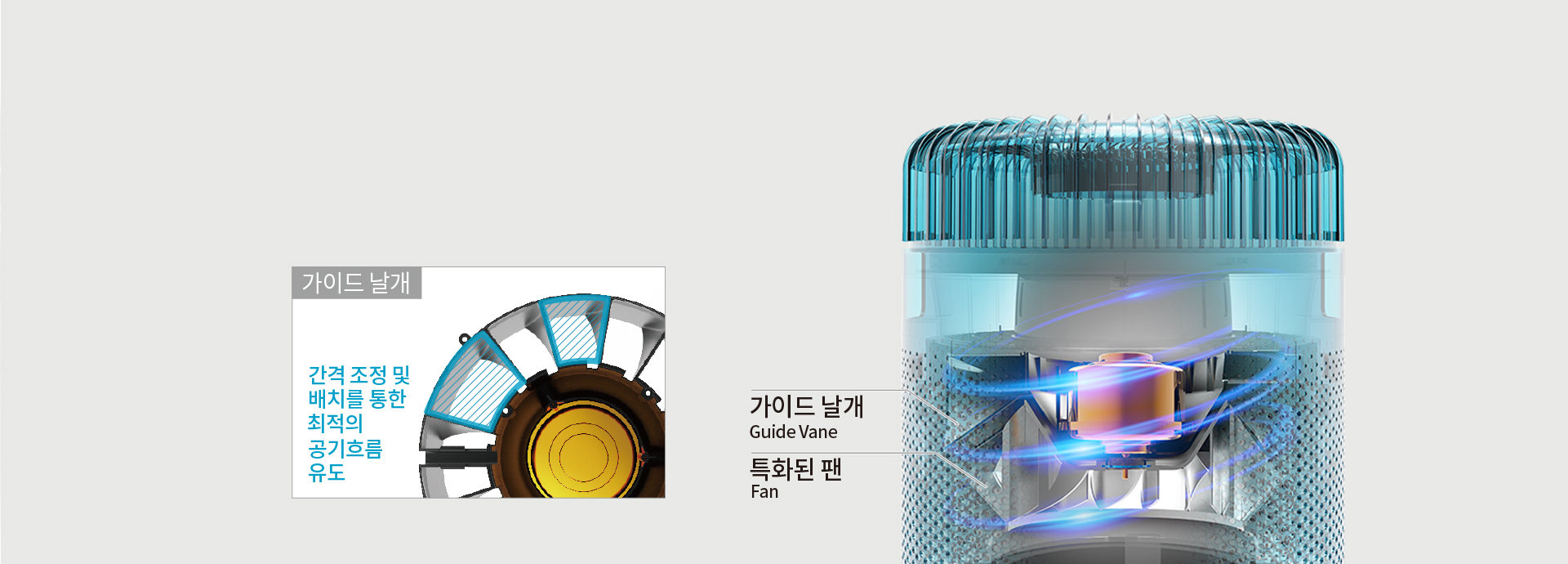 타워형 공기청정기에 특화된 팬과 공기흐름을 제어하는