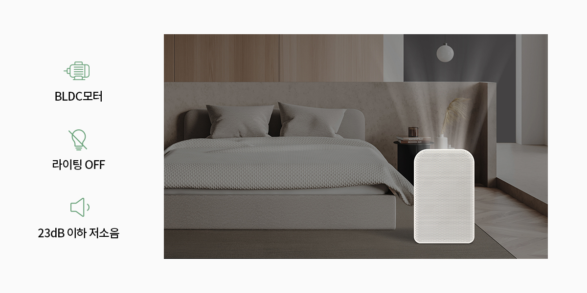 23 dB 이하의 저소음으로 가동하여 조용하고 편안한 숙면을 돕습니다.