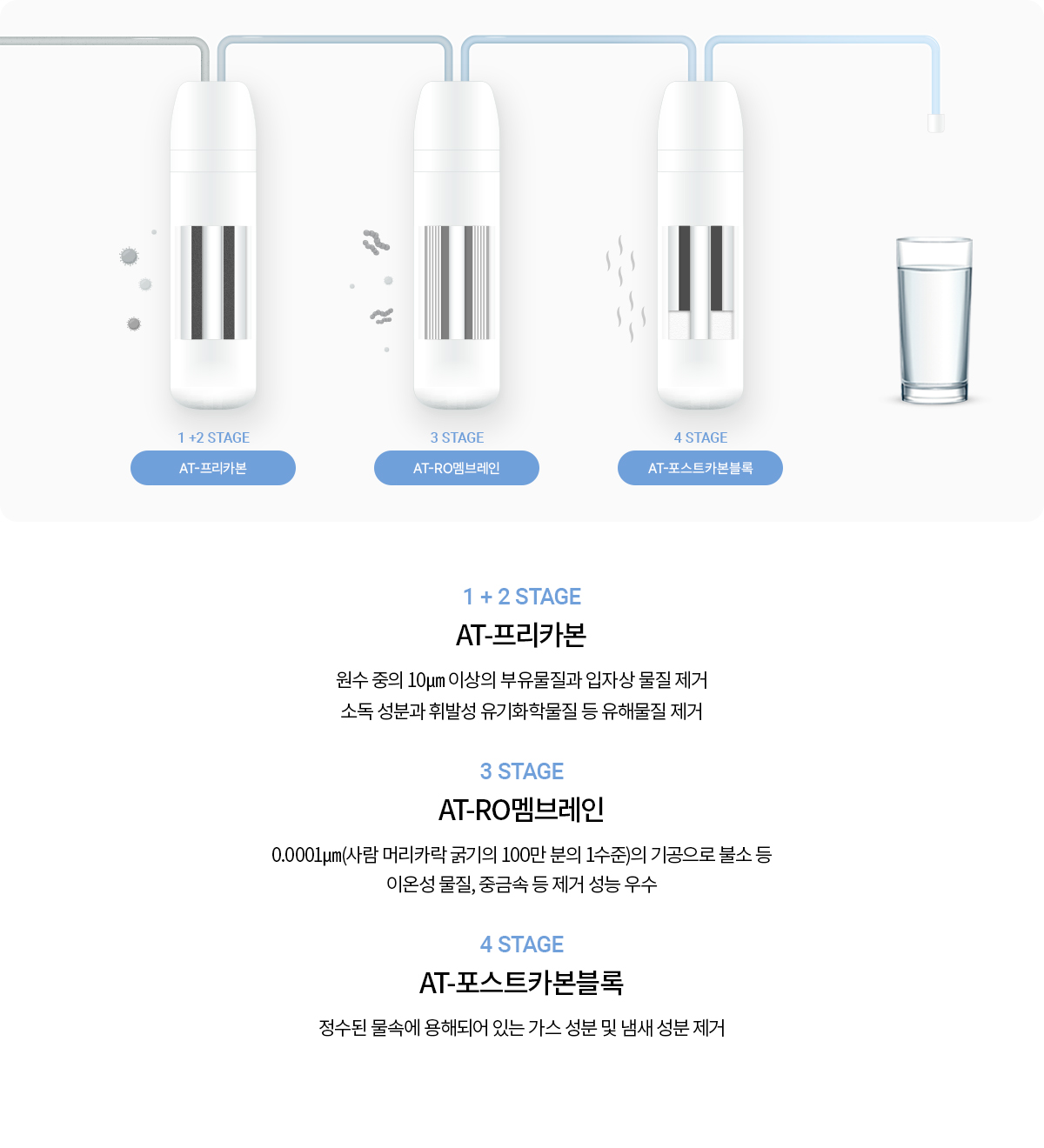 눈에 보이지 않는 물속 유해 이온성 물질, 박테리아, 중금속 등 44종의 물질을 깨끗하게 걸러 정수합니다.