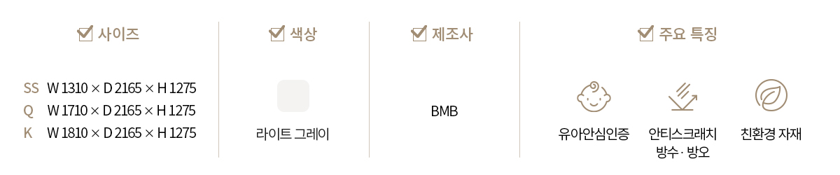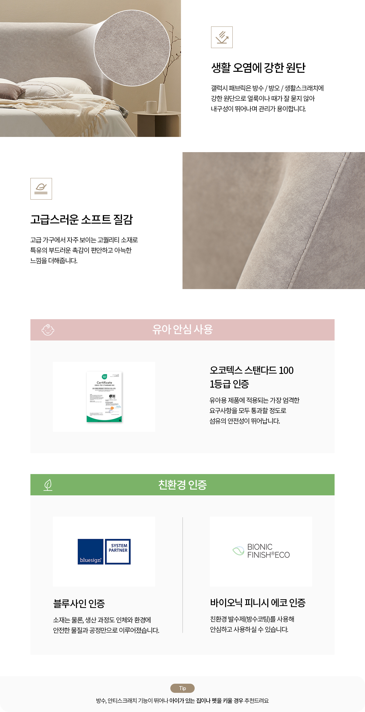 생활오염 방지, 부드러운 촉감, 친환경 인증 등 차별화된 기능을 선사합니다.
