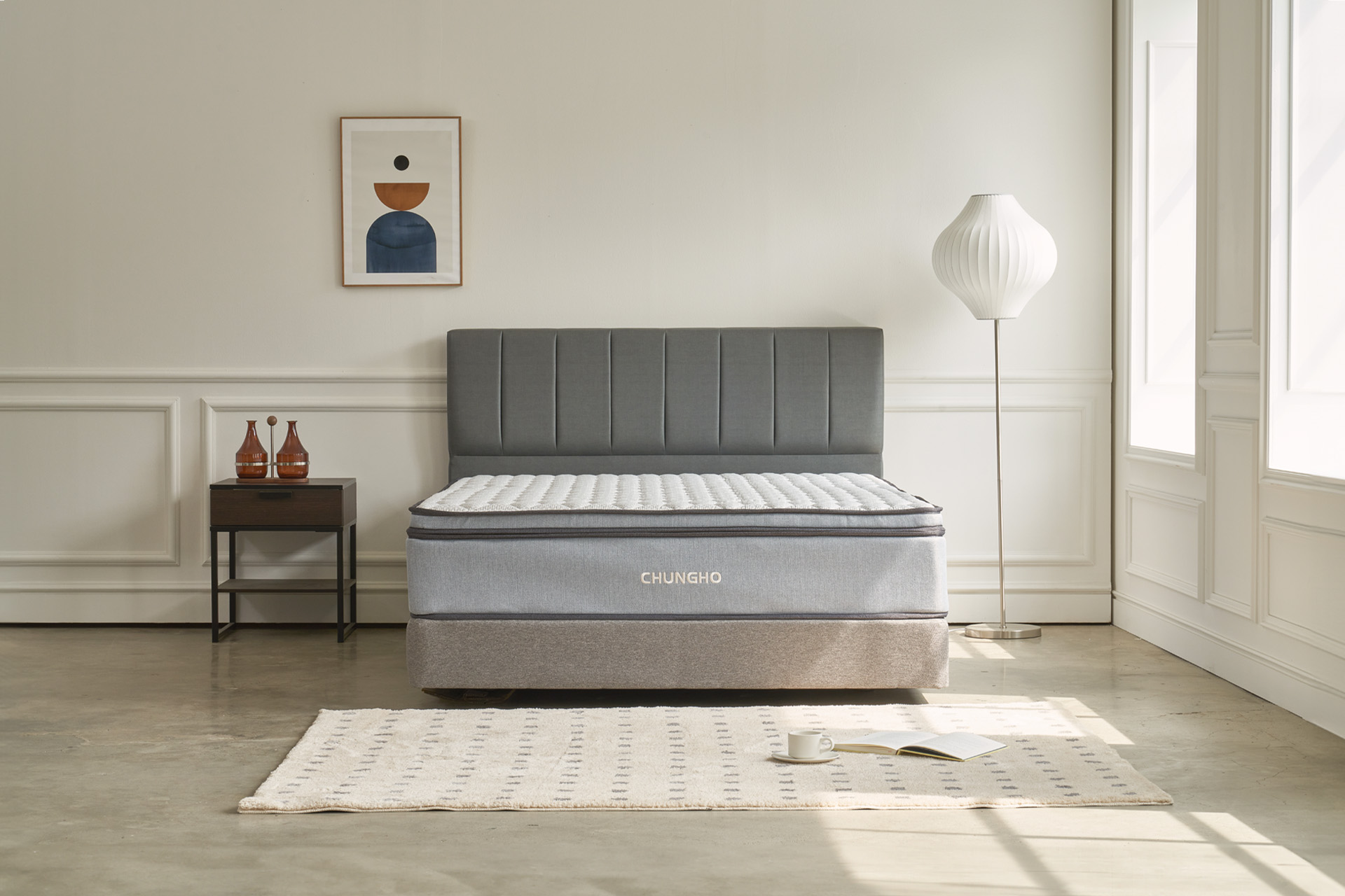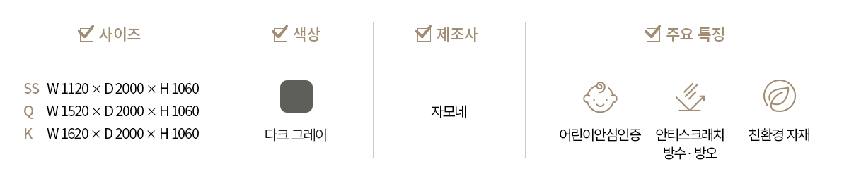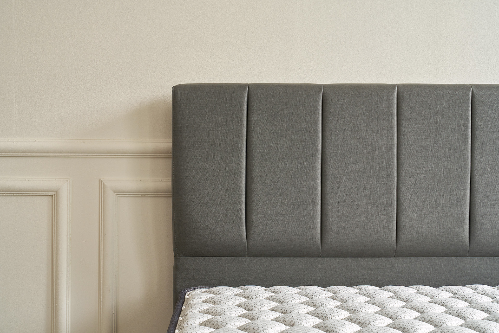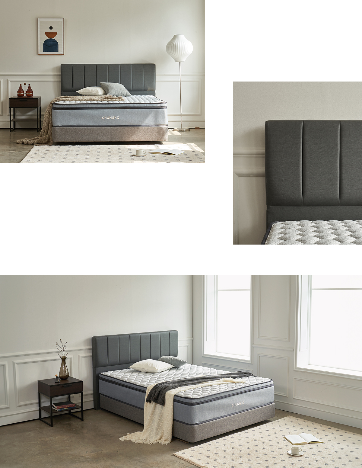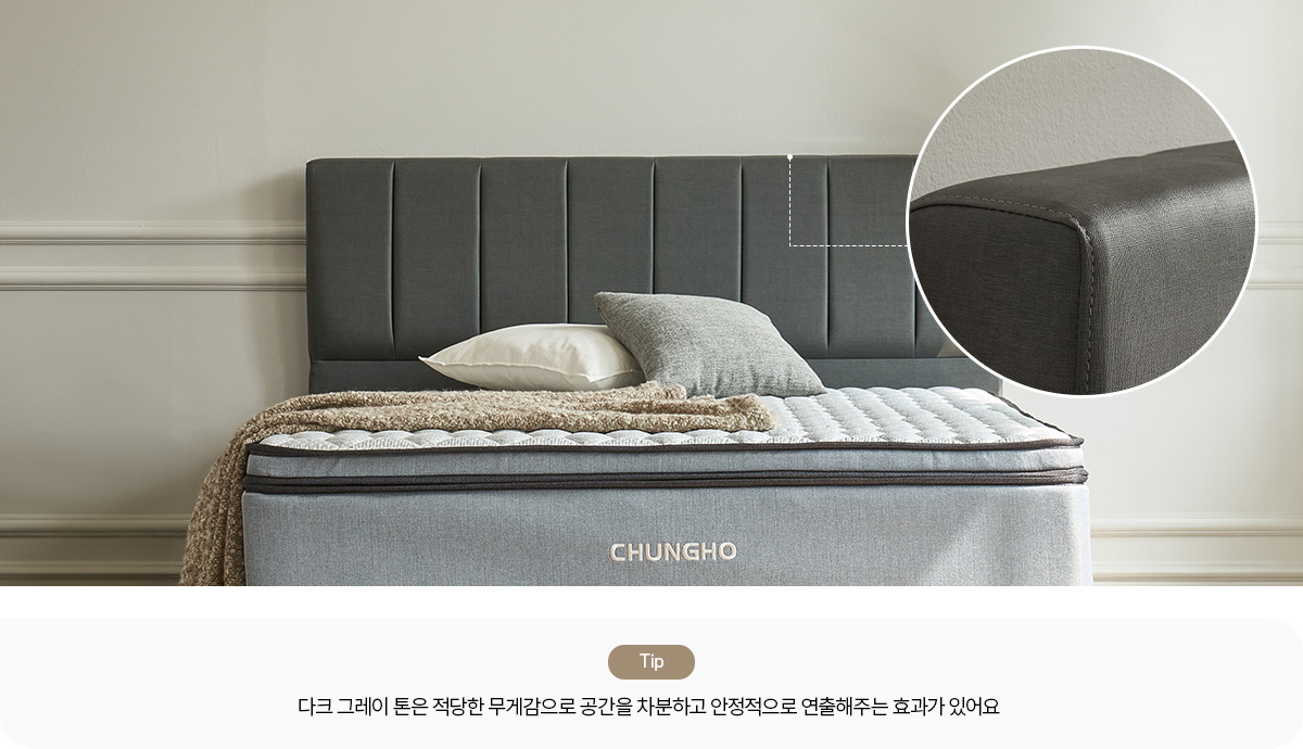 헤드보드의 다크 그레이 컬러로 시크하면서도 클래식한 멋을 연출해보세요.