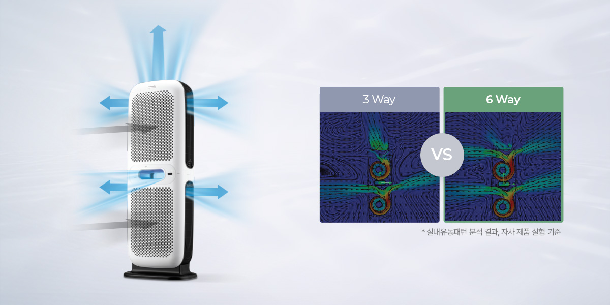 6개의 방향으로 청정한 공기를 토출하여 골고루 더 빠르게 실내 공기를 바꾸어 줍니다.