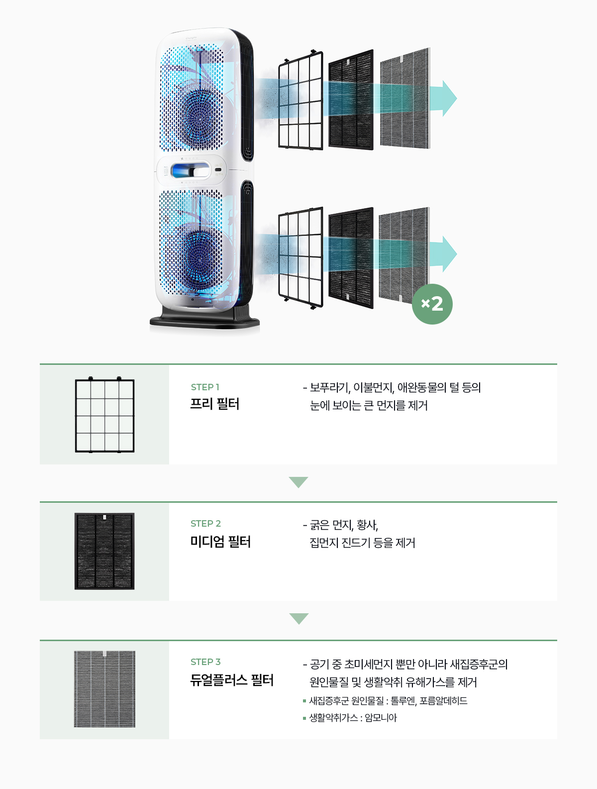 2개의 강력한 필터 시스템으로 눈에 보이지 않는 초미세먼지는 물론
