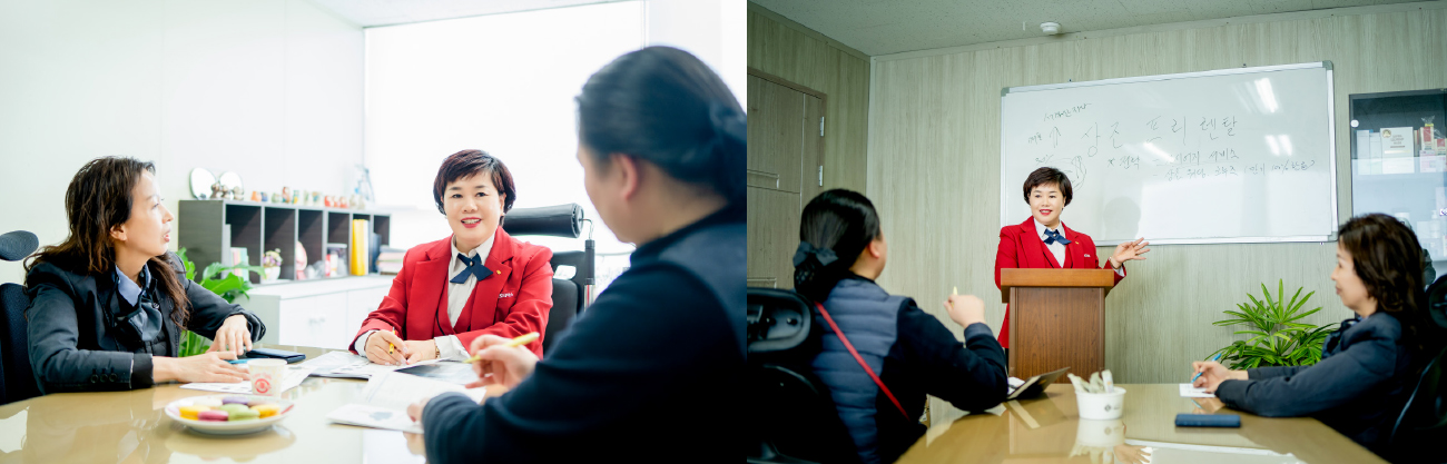 “제가 직접 마산 고객들을 상대로 다양 한 시뮬레이션을 돌려 보니까 마산 지역에서는 보급형 정수기를 오래 무료로 사용하는 것에 관심을 더 보이셨어요. 그래서 ‘특사’를 잘하는 몇몇 플래너는 원래 정책대로 진행하되, ‘특사’가 부담스러운 플래너는 보급형 정수기 렌탈 전략으 로 보완을 했어요. 그리고 특판은 오늘 계약을 해도 설치까지 3일이 걸리는데, 상조는 카드만 있으면 다음 날 바로 설치가 가능하거든요. 이렇게 계속 장점을 찾아서 고객분들께 어필할 수 있도록 제가 플래너분들에게 맞춤형으로 1:1 교육을 계속하고 있어요.”