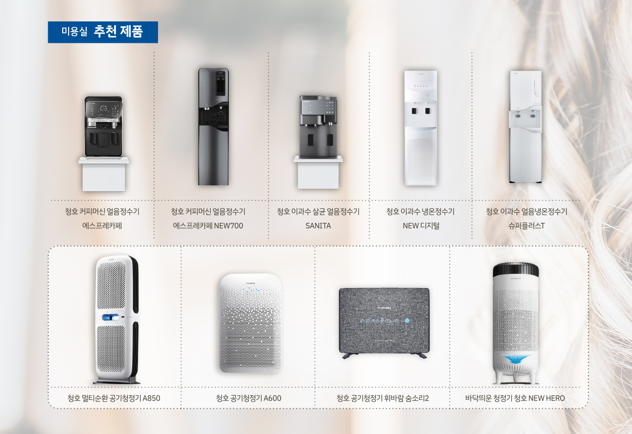 이외에도 쾌적한 실내 공기질을 위해 청호나이스 공기청정기와, 화장실에 비데까지 갖춰놓는 다면 미용실을 방문한 고객님은 서비스에 큰 감동을 받을 것입니다. 청호나이스의 정수기, 공기청정기, 비데가 케어하는 안심 케어존에서 고객분들이 즐겁고 만족스러운 시간을 보낼 수 있도록 청호나이스 제품을 사용해 보세요!