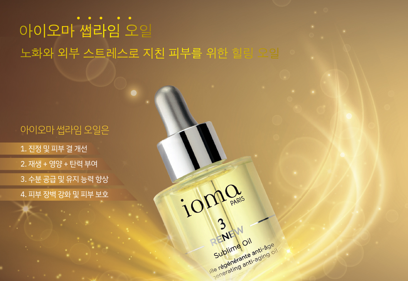 누구에게나 시간은 똑같이 흐릅니다. 그로인한 노화 역시 막을수 없는데요, 노화가 진행되면 우리의 피부는 점점 약해집니다. 피부를 구성하는 콜라겐과 엘라스틴이 손상되어 피부 보호 능력이 떨어지며, 보습인자와 히알루론산이 감소해 건조해집니다. 또한 자외선 등 외부 환경으로 인해 다크닝 현상 등 피부 손상이 점점 가속화 됩니다. 시간을 막을 수는 없기때문에, 내 피부를 미리미리 보호하고 지켜주는 스킨케어가 꼭 필요합니다.아이오마 썹라임 오일은 안티에이징 기능이 특화된 제품으로 보습과 영양, 진정과 재생에 효과적입니다.