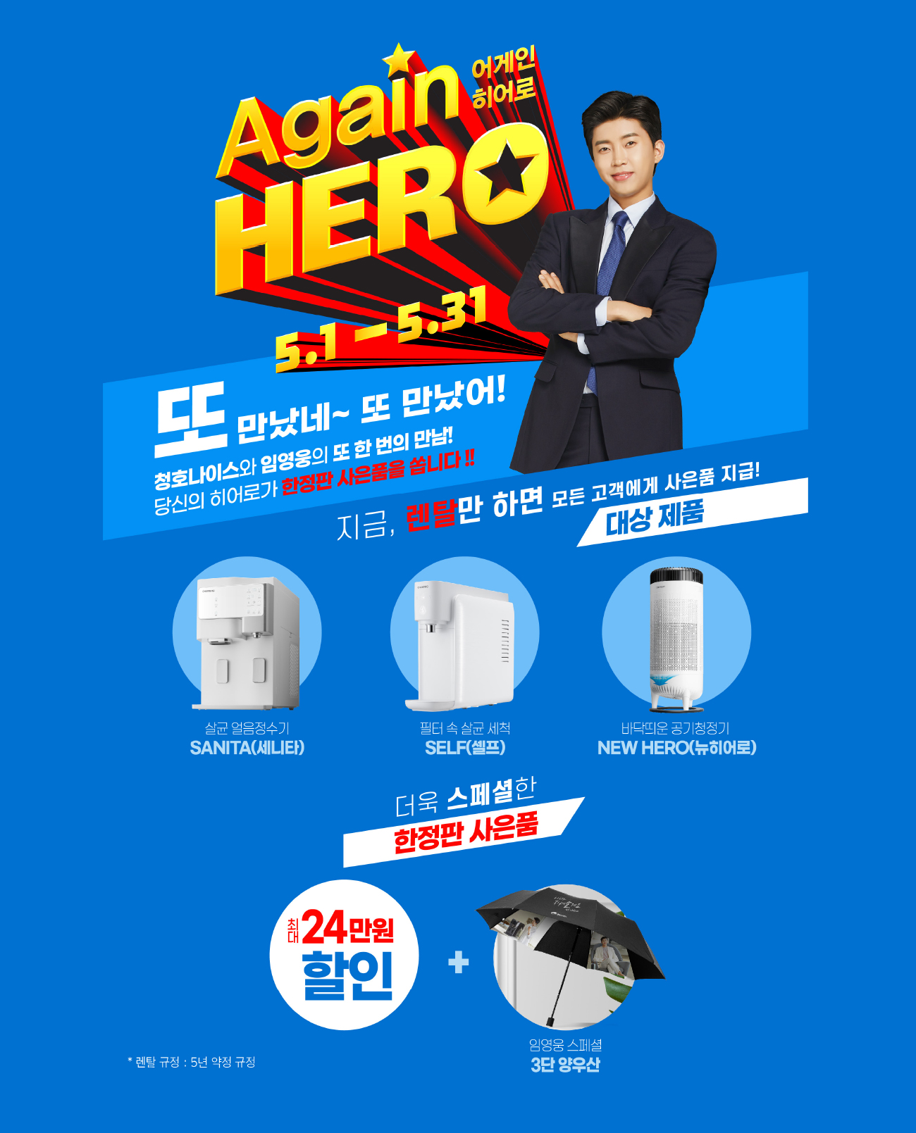 내년 4월까지 청호나이스의 얼굴이 될 가수 임영웅은 새롭게 출시될 신제품과 더불어 살균얼음정수기 세니타 등 청호의 정수기와 공기청정기를 알리는 홍보 역할을 맡게 될 것입니다. 깨끗한 물과 공기로 건강한 삶을 지키겠다는 청호나이스와, 특유의 가창력을 겸비한 맑은 이미지의 임영웅의 시너지가 올 한 해에도 계속 이어지도록 많은 관심을 부탁 드립니다!