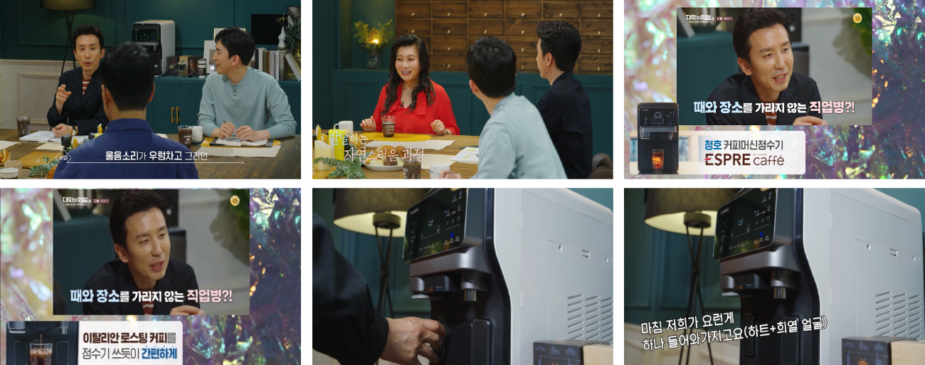 유희열, 신지혜, 김중혁, 이승국 네 명의 MC가 진행하는 인기 예능프로그램 ‘대화의 희열 3’에 커피머신 얼음정수기 에스프레카페가 소개됩니다. ‘대화의 희열’은 게스트를 초대해 진행하는 토크쇼로 진솔한 이야기를 들을 수 있어 많은 시청자들로부터 큰 인기를 모아 시즌 3까지 이어졌습니다. 해당 프로그램에 배치되어 MC들과 게스트가 맛있게 즐기는 에스프레카페는 에스프레소, 차, 얼음, 냉수, 온수, 미온수, 정수까지 7가지 기능을 한번에 갖춰 편리하게 사용할 수 있는 제품으로, 에스프레카페에 사용되는 커피원두 캡슐은 이탈리아 직수입으로 확실한 품질을 보장합니다. 목요일 저녁 10시 40분부터 12시까지 KBS2에서 진행되는 대화의 희열 3’에서 활약하고 있는 에스프레카페를 만나보세요!