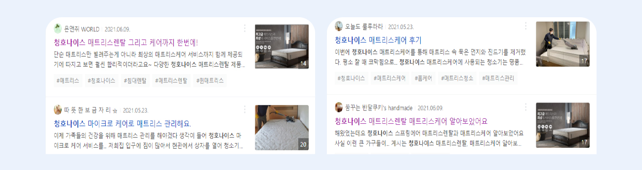 청호나이스라고만 쳐도 블로그 윗상단에 매트리스 케어 후기들이 수두룩하답니다!