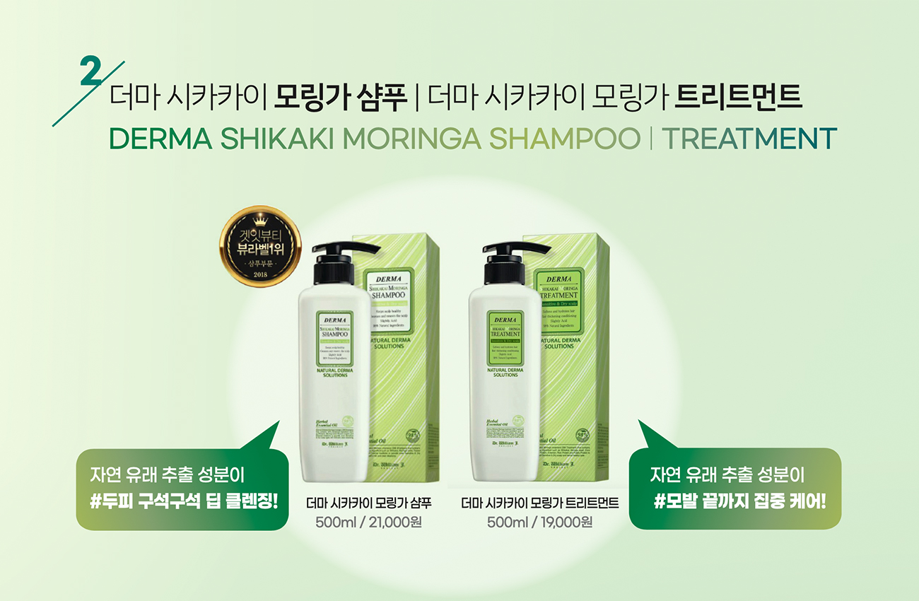 모링가는 다량의 아미노산과 무기물, 비타민 등 90가지 이상의 영양소를 함유하고 있어 두피관리 및 모발 영양에 효과적입니다. 모링가의 풍부한 영양 성분이 모발 깊숙이 영양을 공급해 주어 손상된 모발을 관리해 주며, 지치고 거칠어진 모발을 매끄럽게 감싸주어 윤기나는 머릿결로 가꾸어 줍니다.