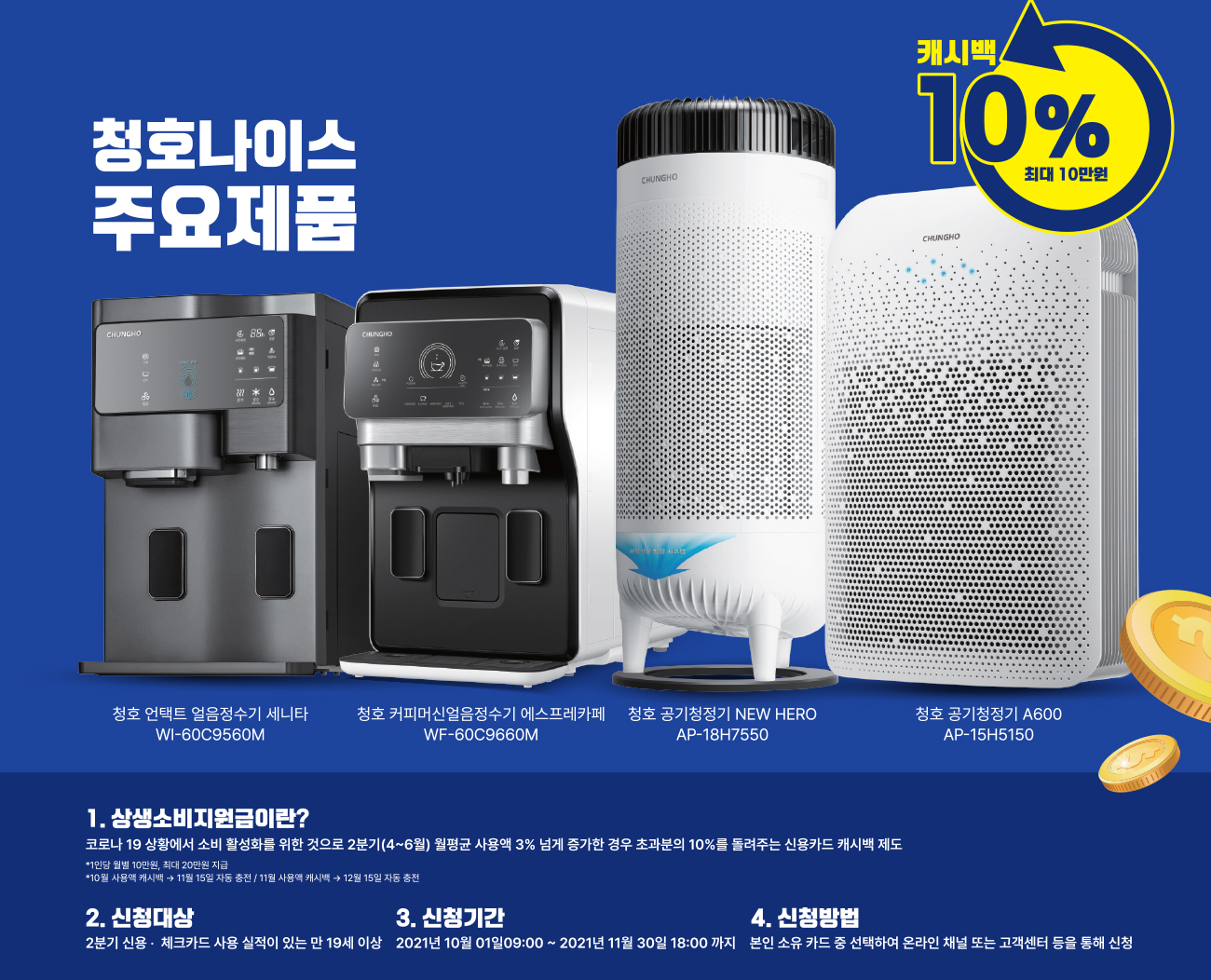 모두가 힘든 코로나 시국, 캐시백도 받고 이 기회에 청호나이스의 좋은 제품들을 사용할 수 있다면 놓치지 말아야겠습니다!