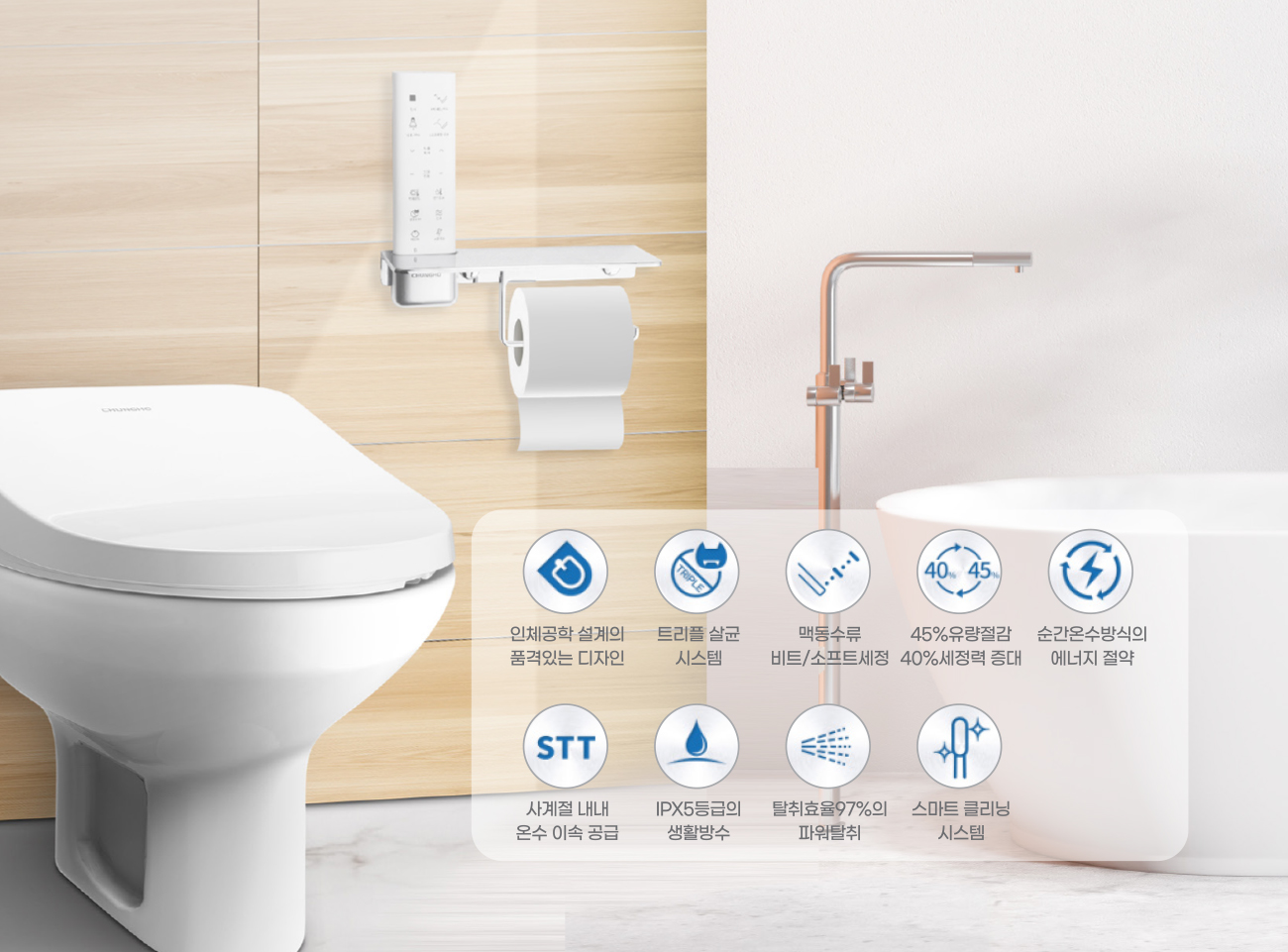 인체공학적인 디자인 편리한 터치패드 리모컨, 편안한 시트 그리고 가족 위생을 관리하는 트리플 살균 시스템 청결한 케어를 약속 드립니다.