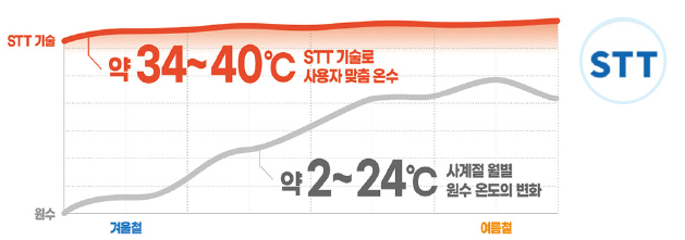 청호나이스만의 독보적인 STT(Self Tunning Tech) 기술로 계절에 따른 원수 온도의 변화에 영향을 받지 않고 사용자가 설정한 온도의 온수를 지속 공급합니다.
