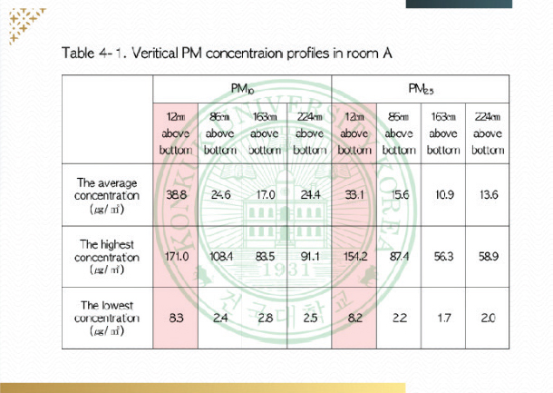 건국대 환경공학과 교수팀이 방바닥으로부터 각각 12cm, 86cm, 163cm, 224cm 높이에서 실내먼지 농도를 측정한 결과, 바닥에서 가장 가까운 12cm 에서 미세먼지가 제일 많은 것으로 나타났습니다.