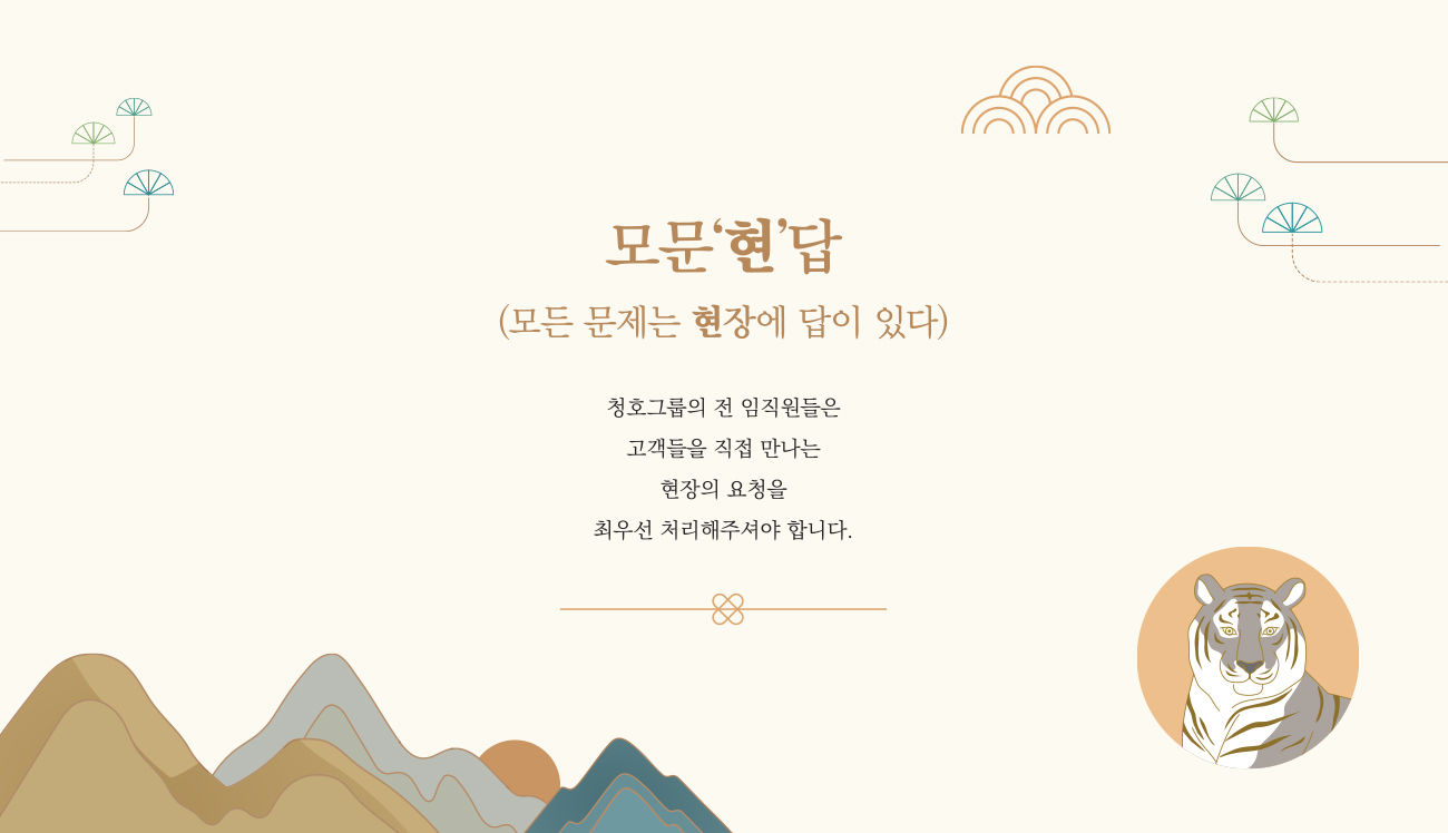 우리도 검은 호랑이의 강인함을 닮아봅시다.우리 모두가 강인한 도전정신과 열정으로 끊임없이 새로운 성장 돌파구를 만든다면 지금까지와 같이 앞으로도 청호그룹은 지속적인 성장을 충분히 이뤄낼 수 있으리라 확신합니다.