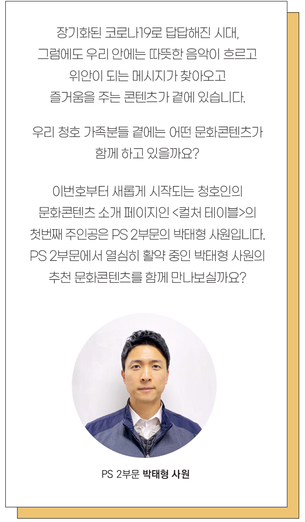 새롭게 선보이는 <컬처 테이블>은 청호인의 다채로운 문화 콘텐츠 추천 페이지입니다.