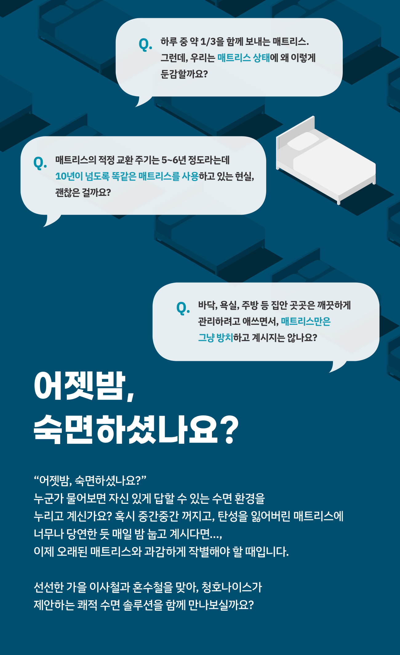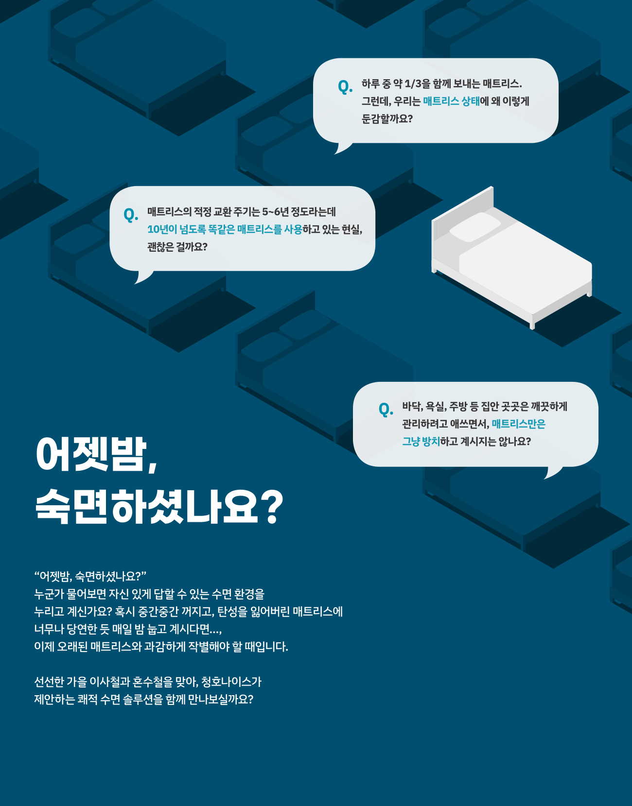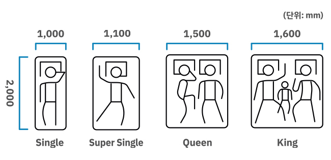 매트리스 사이즈를 선택할 때는 사용자가 누군지, 사용자가 원하는 매트리스 내 여유 공간이 얼마만큼인지(수면 자세 고려), 공간의 크기 등을 고려해야 합니다. 청호나이스 매트리스 라인업은 킹(K), 퀸(Q), 슈퍼싱글(SS), 싱글(S)로 다양하게 구성되어 있습니다.