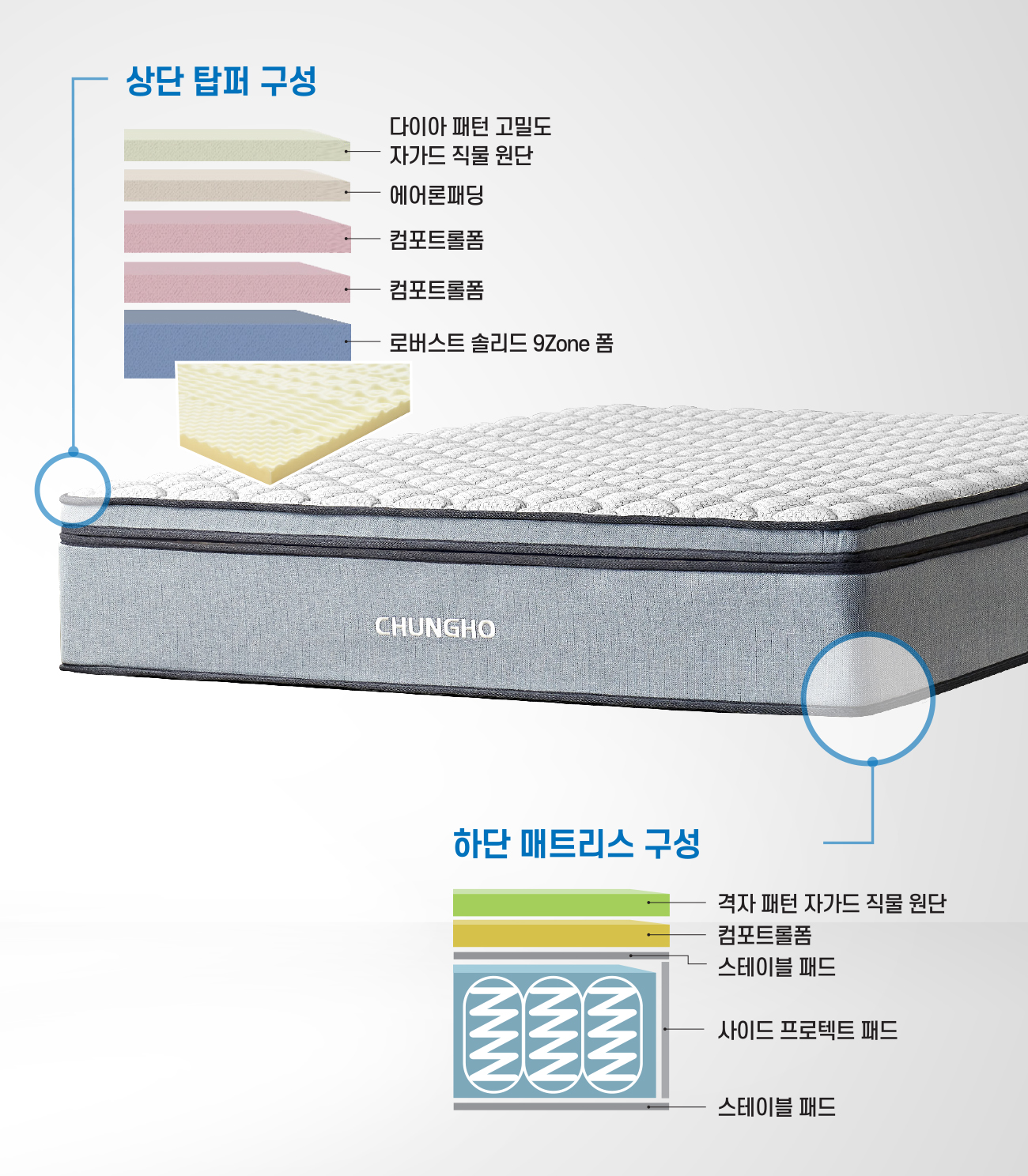 1. 엠보싱존이 존재하는 로버스트 솔리드 9Zone 폼이 내재된 탑퍼는 고밀도의 강력한 내구성과