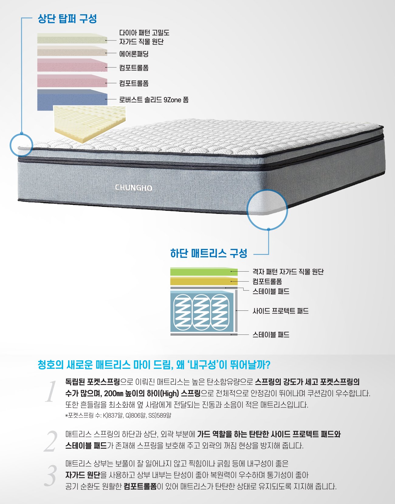 1. 독립된 포켓스프링으로 이뤄진 매트리스는 높은 탄소함유량으로 스프링의 강도가 세고 포켓스프링의 수가 많으며, 200㎜ 높이의 하이(High) 스프링으로 전체적으로 안정감이 뛰어나며 쿠션감이 우수합니다. 또한 흔들림을 최소화해 옆 사람에게 전달되는 진동과 소음이 적은 매트리스입니다. *포켓스프링 수: K)837알, Q)806알, SS)589알